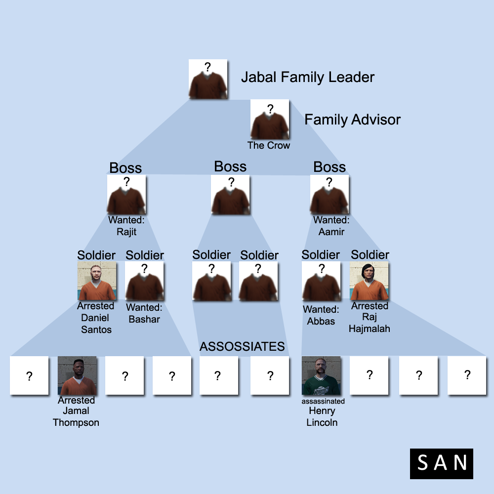 It is evident that crime in San Andreas have had a spike in the passed couple of weeks but when did it really happen? Indian immigrant from Mumbai, Rajut Patel established the organization in the 1990s as part of the Mumbai faction of the Liberty City crime family. An internal war broke out by the early 2000s which resulted in the death of acting captain Marjik Aziz and his brothers, allowing the Patels to overtake the Liberty City crime Family as the preeminent crime family in Liberty city. Rajut's son Semar was indicted in 2004 and imprisoned from 2007 until 2012 for murders in which he participated in 1991, causing a power struggle among criminals in Liberty City. During Semar's imprisonment, his son Rajut Jr. was killed in 2009, and Rajut Sr. was shot by a sniper while in his home in 2010. Upon Semar's release, several people were killed in what was suspected to be retaliation for the murders of his family. Semar died of natural causes in 2013, and the head of the Family is now assumed to have changed to another unknown member, Since then the grip of the indian family known as Jabal Family in San Andreas seems to be stronger and stronger, San Andreas News got exclusive information on arrests made by the Sheriff's department over the last few weeks.